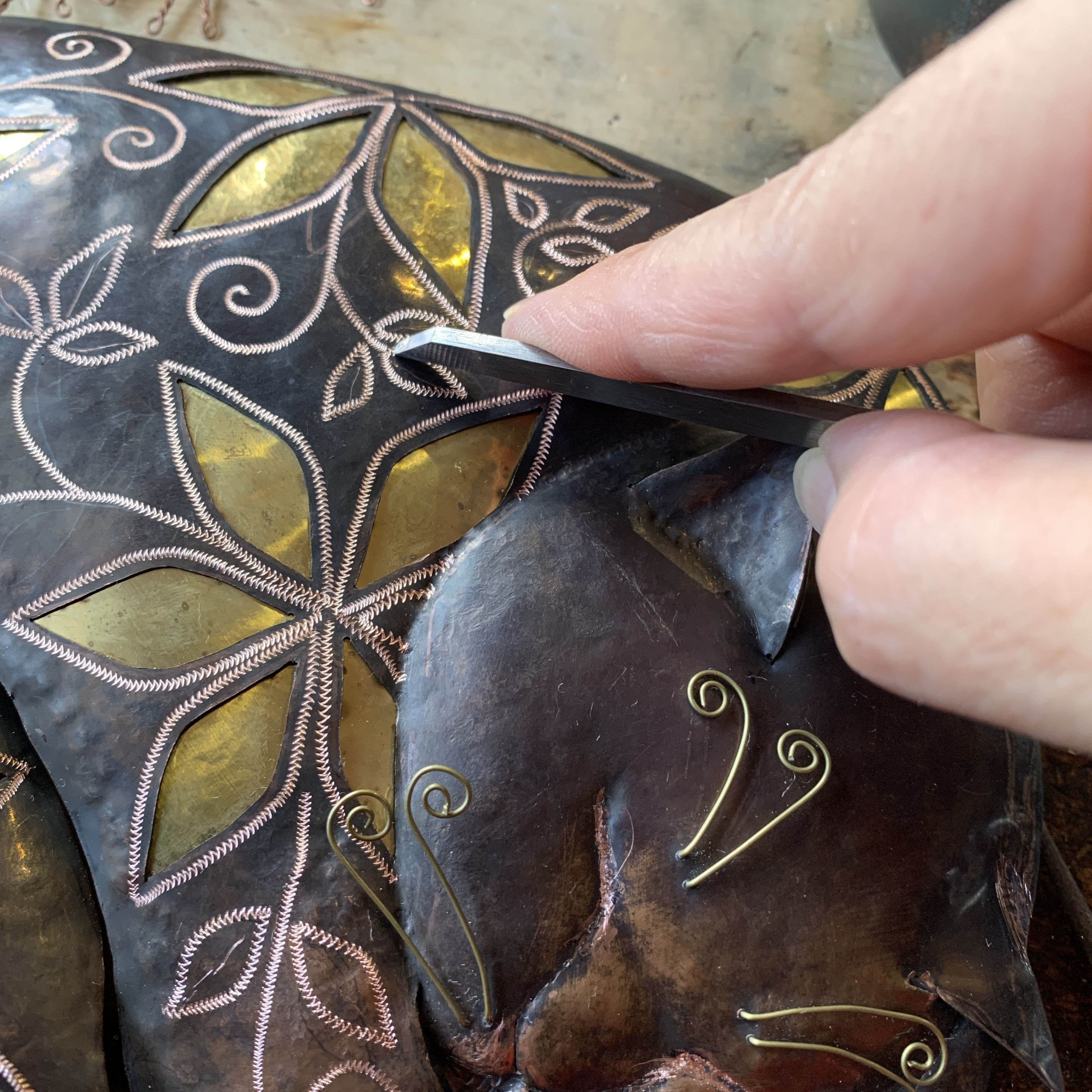 現在はワイヤー・金工・ステンドグラスを融合したミクストメディア作品を展開し、