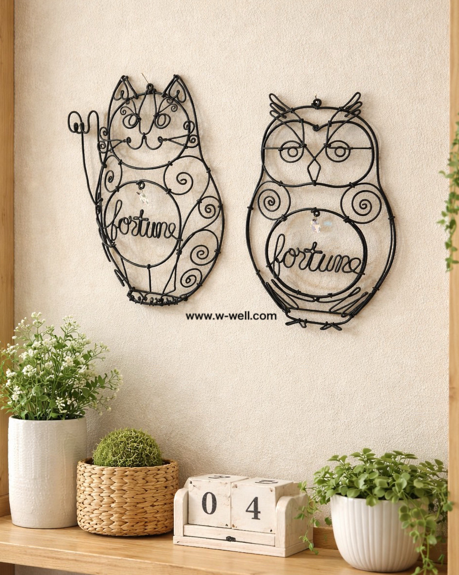 半立体または平面タイプの招き猫と梟の壁掛けプレート。(画像は半立体タイプ)
