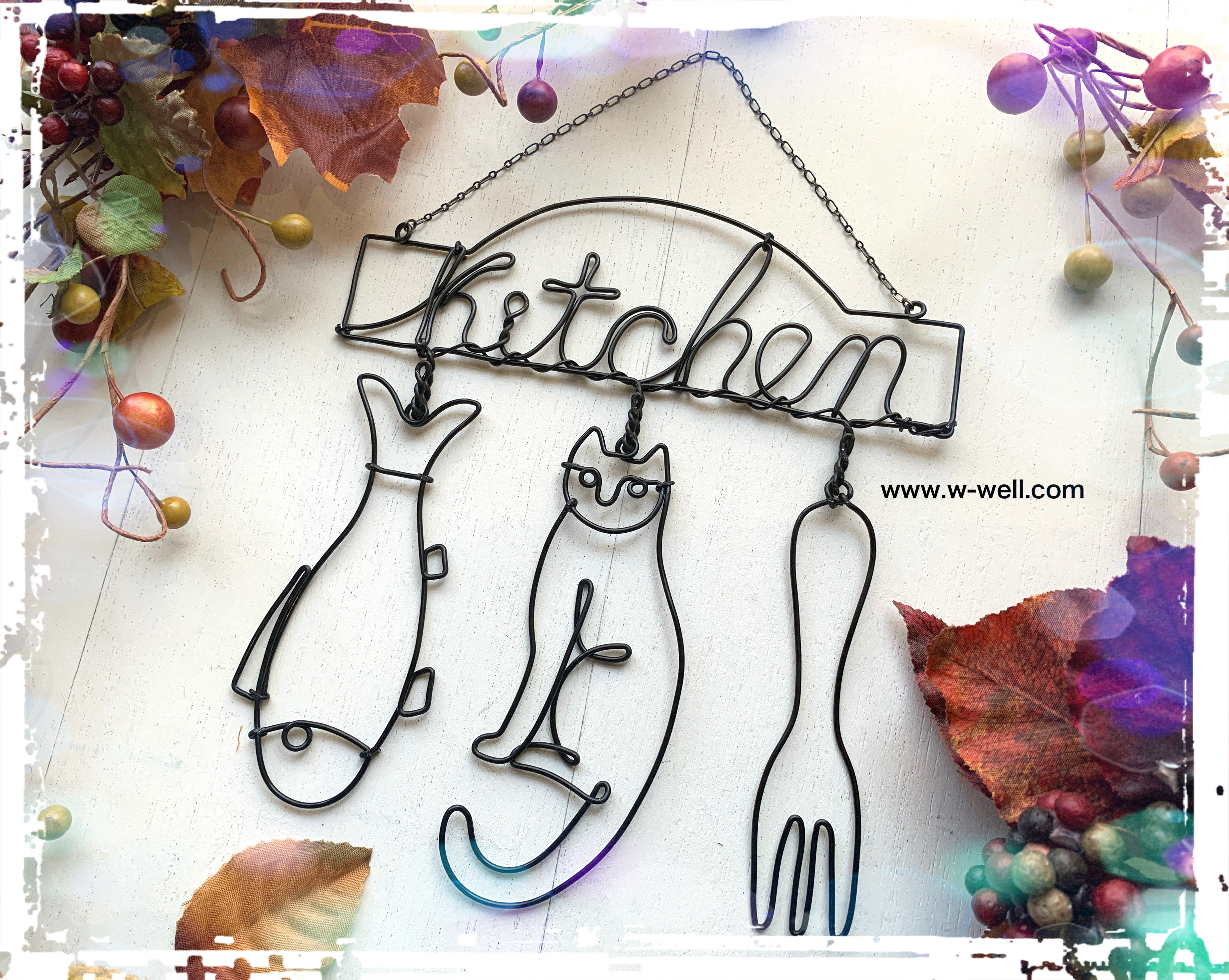 『Kitchen』の文字が入ったフック付きプレートにそれぞれお魚スプーン、猫型ヘラ、フォークがぶら下がっています。